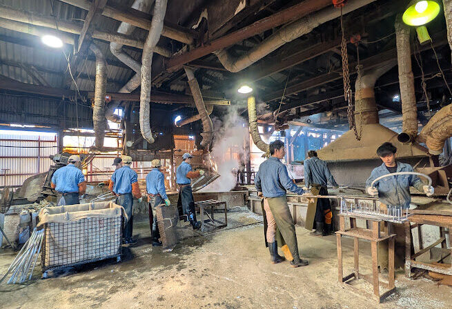 加工工程に進めるために、脱脂曹に進むもの、ショットブラスト工程に進むものを分けます。工程に進めるための陳列や下準備の開始です。